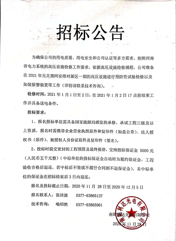 新廠區(qū)高壓配電設(shè)備預(yù)防性試驗(yàn)招標(biāo)公告
