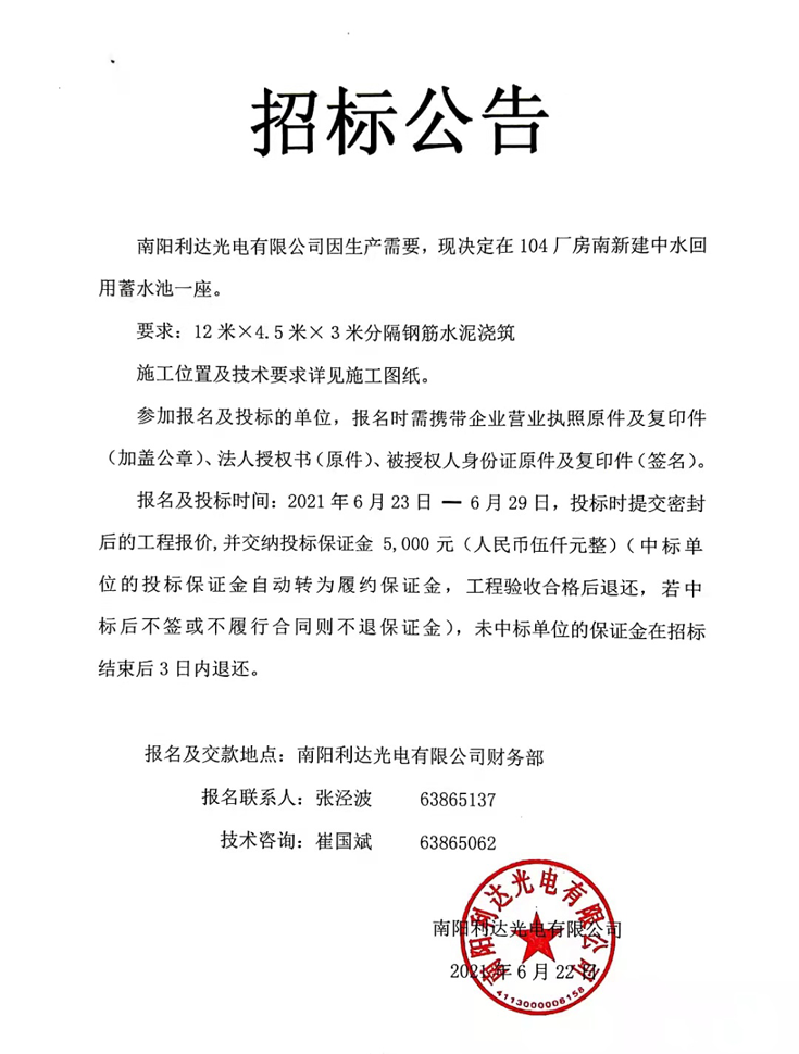 104廠房南新建中水回用蓄水池一座招標(biāo)公告