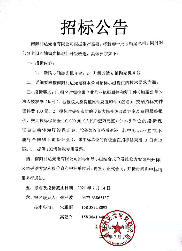 棱鏡事業(yè)部新購及升級改造6軸拋光機(jī)招標(biāo)